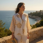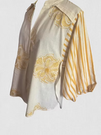This is a flex cotton tunic crafted for flow — in movement, in mood, and in meaning. With thread-embroidered florals blooming across the front and soft stripes gracing the exaggerated sleeves, this tunic speaks of contrast — of softness held in strength.