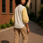 Thread embroidery details — each flower tells a quiet story Exaggerated striped sleeves for graceful volume and presence